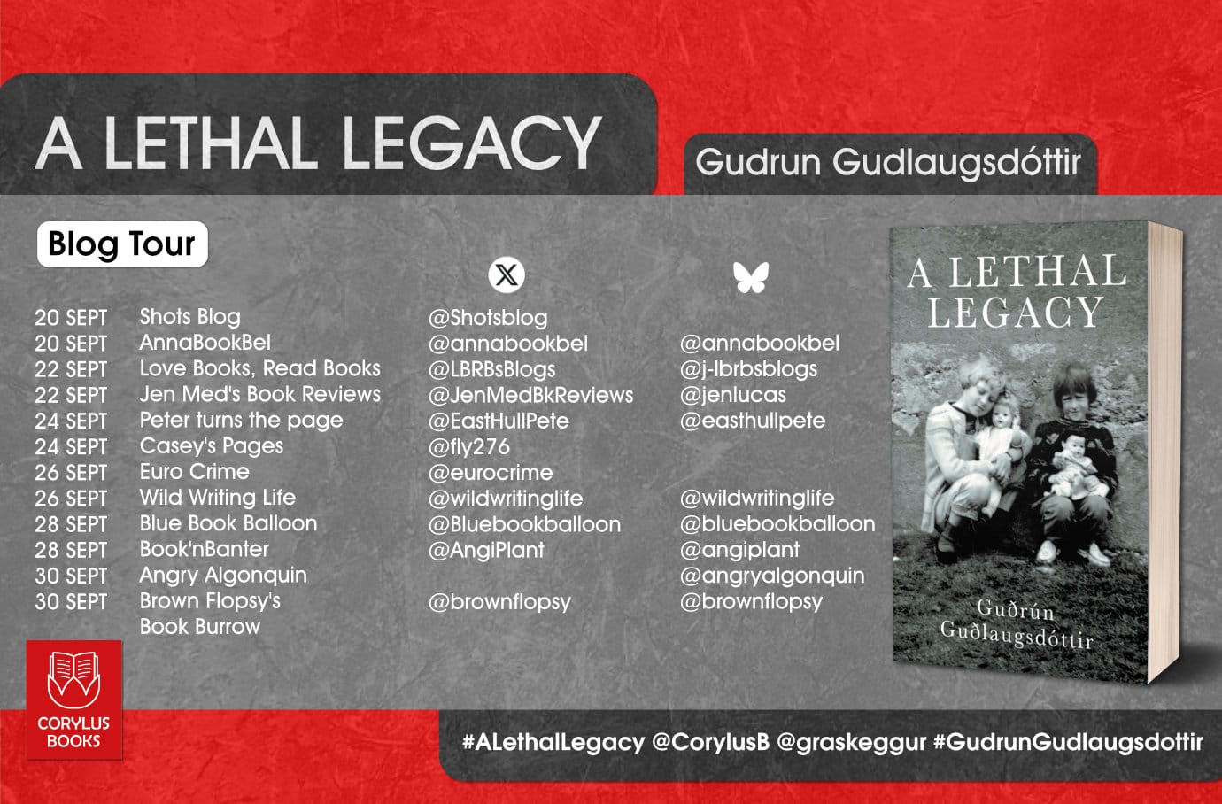 I'm always up for a new Icelandic mystery, so many thanks to Corylus Books for including me on the blog tour for Guðrún Guðlaugsdóttir's "A Lethal Legacy". The book is one in a series by Guðlaugsdóttir featuring freelance journalist Alma Jónsdóttir. "A Lethal Legacy" was translated to English by Quentin Bates, an excellent Nordic Noir author in his own right.